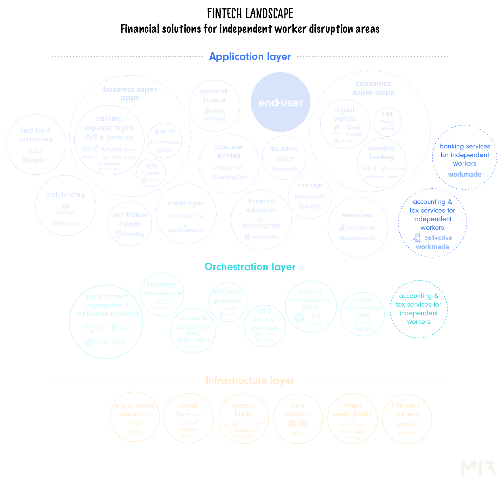 Note: Companies included are illustrative and not exhaustive of players in the space. Our goal is to show the major categories to consider within each layer of the fintech market.